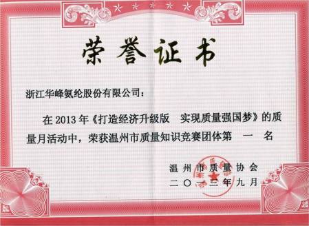 據(jù)悉,為加強(qiáng)質(zhì)量月宣傳力度,同時(shí)也為溫州市、浙江省質(zhì)量知識競賽選拔人才, 9月5日,氨綸公司在內(nèi)部舉行了“2013年氨綸公司質(zhì)量知識競賽”活動,以上三位參賽選手就是公司競賽活動一等獎(jiǎng)和二等獎(jiǎng)獲得者。