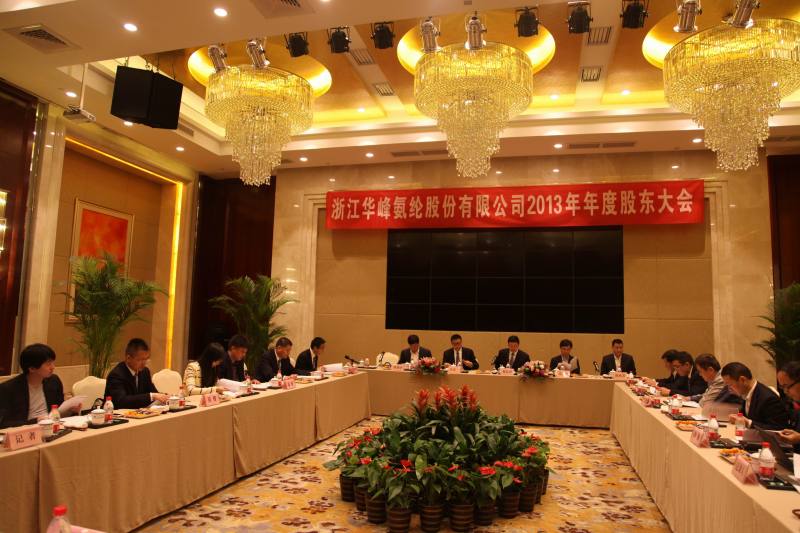 4月21日上午,華峰氨綸在瑞安國(guó)際大酒店召開(kāi)了2013年年度股東大會(huì),公司股東及股東代表共15人參加會(huì)議,獨(dú)立董事端小平、公司部分監(jiān)事、董事及高管列席本次會(huì)議,會(huì)議由董事長(zhǎng)楊從登主持。會(huì)議審議并通過(guò)了2013年度董事會(huì)工作報(bào)告、監(jiān)事會(huì)工作報(bào)告、財(cái)務(wù)決算報(bào)告、年度利潤(rùn)分配預(yù)案和續(xù)聘立信會(huì)計(jì)事務(wù)所議案等七項(xiàng)議案。