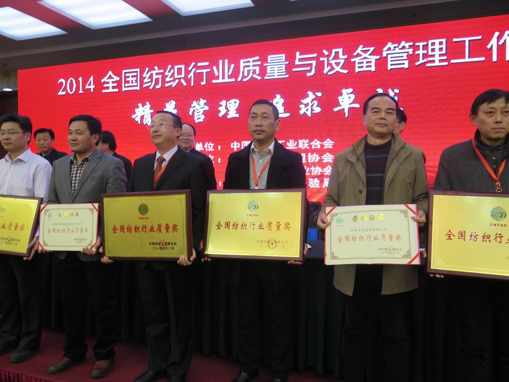 12月25日,2014年全國紡織行業(yè)質(zhì)量與設(shè)備管理工作會在山東省濟(jì)南市召開,來自工信部、中紡聯(lián)與紡織各行業(yè)協(xié)會相關(guān)負(fù)責(zé)人及企業(yè)代表200余人參加了會議,華峰氨綸榮獲第三屆“全國紡織行業(yè)質(zhì)量獎”。