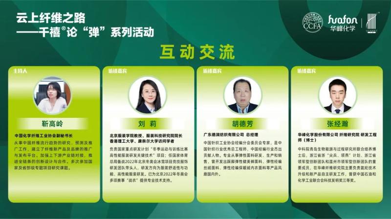 在訪談環(huán)節(jié),本期嘉賓針對(duì)冬奧運(yùn)動(dòng)紡織品聯(lián)合開發(fā)過(guò)程及成果、纖維端如何在產(chǎn)業(yè)價(jià)值鏈中實(shí)現(xiàn)業(yè)務(wù)驅(qū)動(dòng)、千禧氨綸創(chuàng)新技術(shù)等進(jìn)行了分享。