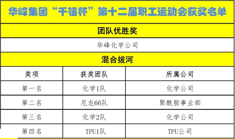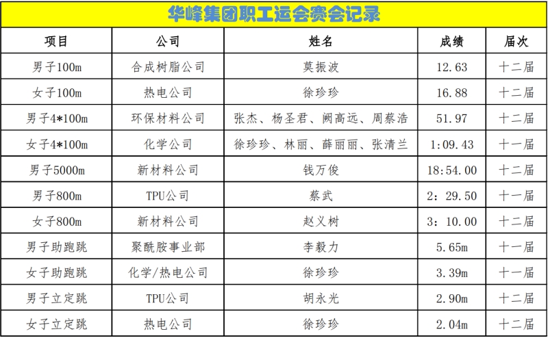 值得一提的是,本屆運(yùn)動會還首次設(shè)立了“華峰運(yùn)動會紀(jì)錄榜”,激勵(lì)更多身邊人比學(xué)趕超、奮勇爭先。其中,由張杰、闕高遠(yuǎn)、楊圣君、周蔡浩領(lǐng)銜的環(huán)保代表隊(duì)以51秒97的成績合力打破了男子4X100米接力的賽事記錄,來自新材料生產(chǎn)制造部的趙義樹在蟬聯(lián)冠軍的同時(shí)一舉打破了由自己保持的女子800米跑記錄。